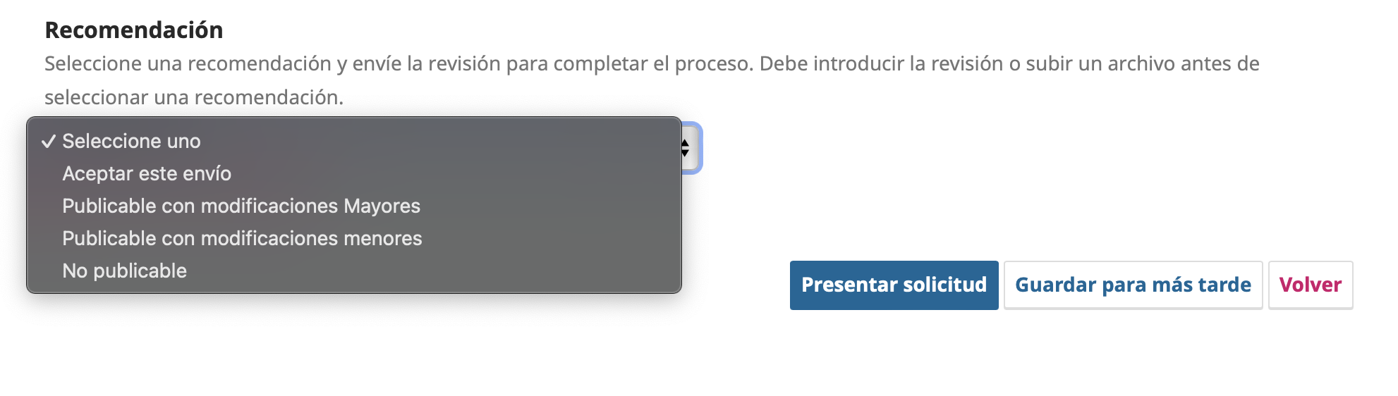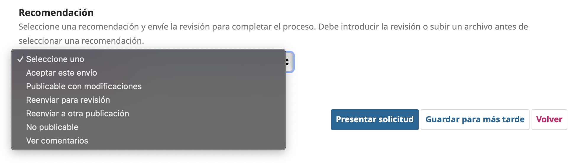 static function getReviewerRecommendationOptions() { static $reviewerRecommendationOptions = array( '' => 'common.chooseOne', SUBMISSION_REVIEWER_RECOMMENDATION_ACCEPT => 'reviewer.article.decision.accept', SUBMISSION_REVIEWER_RECOMMENDATION_PENDING_REVISIONS => 'reviewer.article.decision.pendingRevisions', SUBMISSION_REVIEWER_RECOMMENDATION_RESUBMIT_HERE => 'reviewer.article.decision.resubmitHere', SUBMISSION_REVIEWER_RECOMMENDATION_RESUBMIT_ELSEWHERE => 'reviewer.article.decision.resubmitElsewhere', SUBMISSION_REVIEWER_RECOMMENDATION_DECLINE => 'reviewer.article.decision.decline', SUBMISSION_REVIEWER_RECOMMENDATION_SEE_COMMENTS => 'reviewer.article.decision.seeComments' ); return $reviewerRecommendationOptions; }Eliminar las opciones no deseadas: